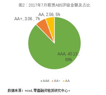 从已披露的发行利率来看,7月租赁ABS发行利率区间在5.0%-7.01%,4只产品加权平均利率为5.4964%,较公司债7月份AAA级的加权平均发行利率4.7497%高74BP,而较6月加权发行平均利率的5.9599%而言,7月发行利率却呈下降趋势,主要受发行结构极值影响较大所致。整体而言,7月发行利率仍处高位,主要受2017年上半年以来市场利率走高的影响,资金成本仍较高。