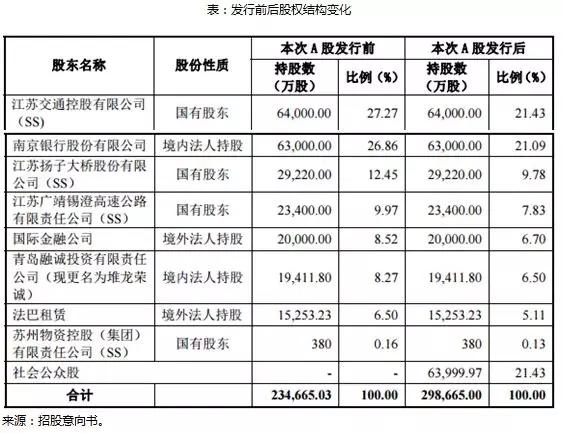 目前,前5大股东为江苏交通控股持有27.27%股份,南京银行持股26.86%,扬子大桥持股12.45%,广靖锡澄持有9.97%,国际金融公司持股8.52%。国有股东共持股占比为49.85%。