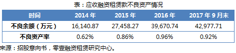 值得关注的是,意向书披露了应收融资租赁款不良率连续上升风险。截至2017年9月末应收融资租赁不良款项达4.2978亿元,不良资产率为0.92%。虽然符合监管要求,但是江苏金租在风险资产管理方面需提高重视。
