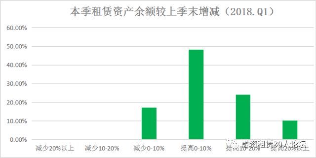 2018年第一季度,11%参与调查高管所在企业租赁资产余额比上季增加20%以上;24%参与调查高管所在企业租赁资产余额比上季增加10-20%;48%参与调查高管所在企业租赁资产余额比上季增加了0-10%;17%参与调查高管所在企业租赁资产余额比上季减少了0-10%。