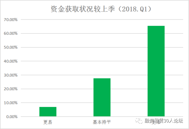 2018年第一季度,7%的被调查高管表示本季度所在企业融资较上季更易,较上季下降1个百分点;28%的被调查高管表示基本持平,较上季下降8个百分点;65%的被调查高管表示本季度所在企业融资较上季更难。